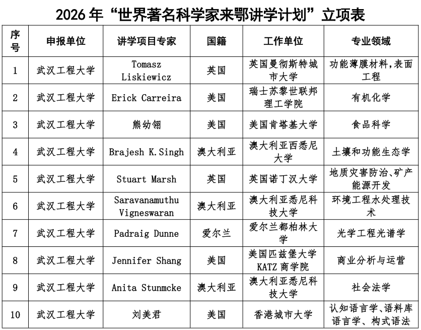 • 學校2026年“世界著名科學家來鄂講學計劃”立項獲批數創歷史新高